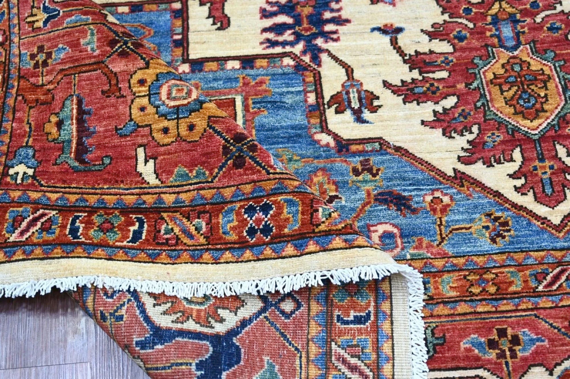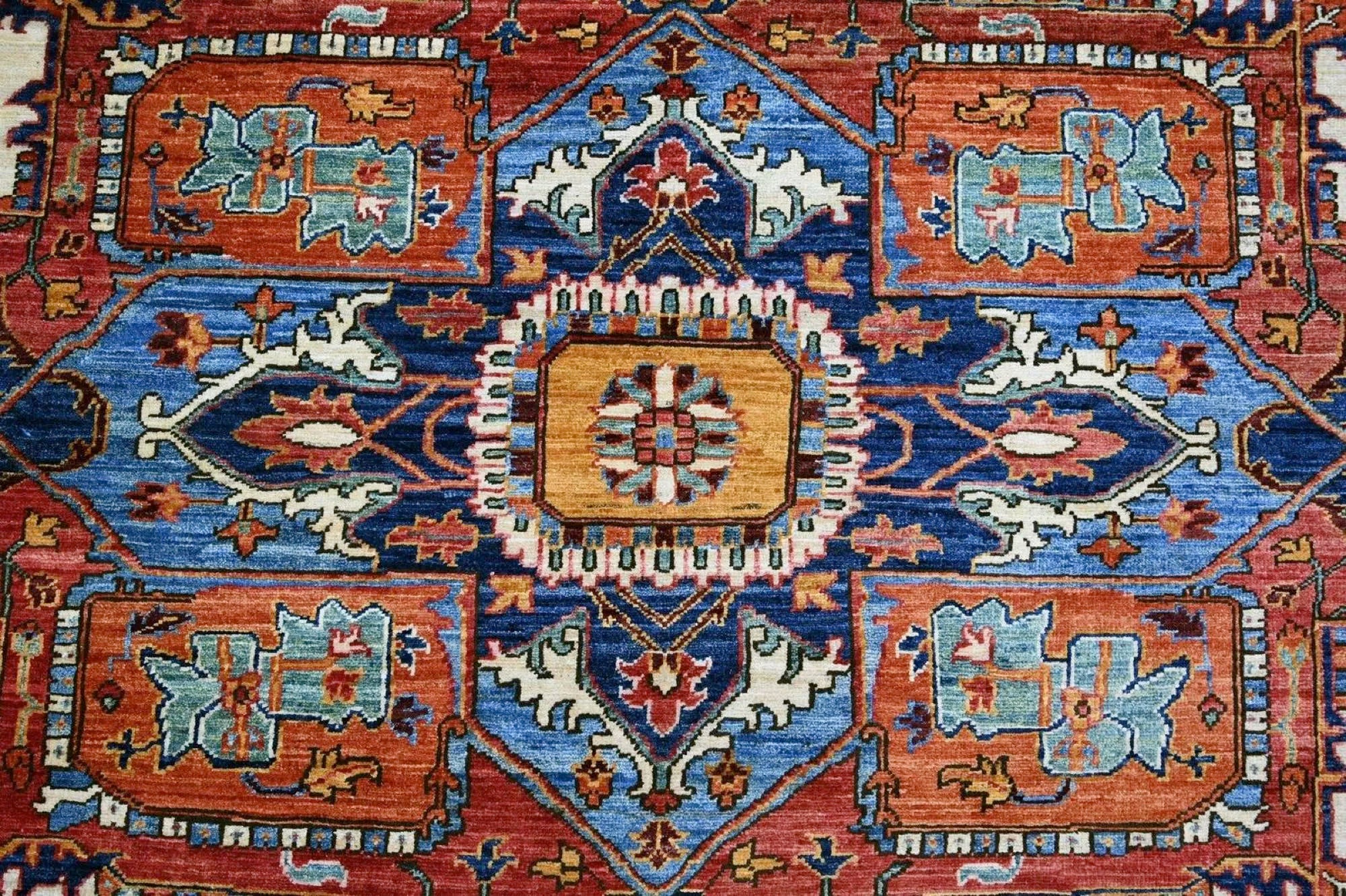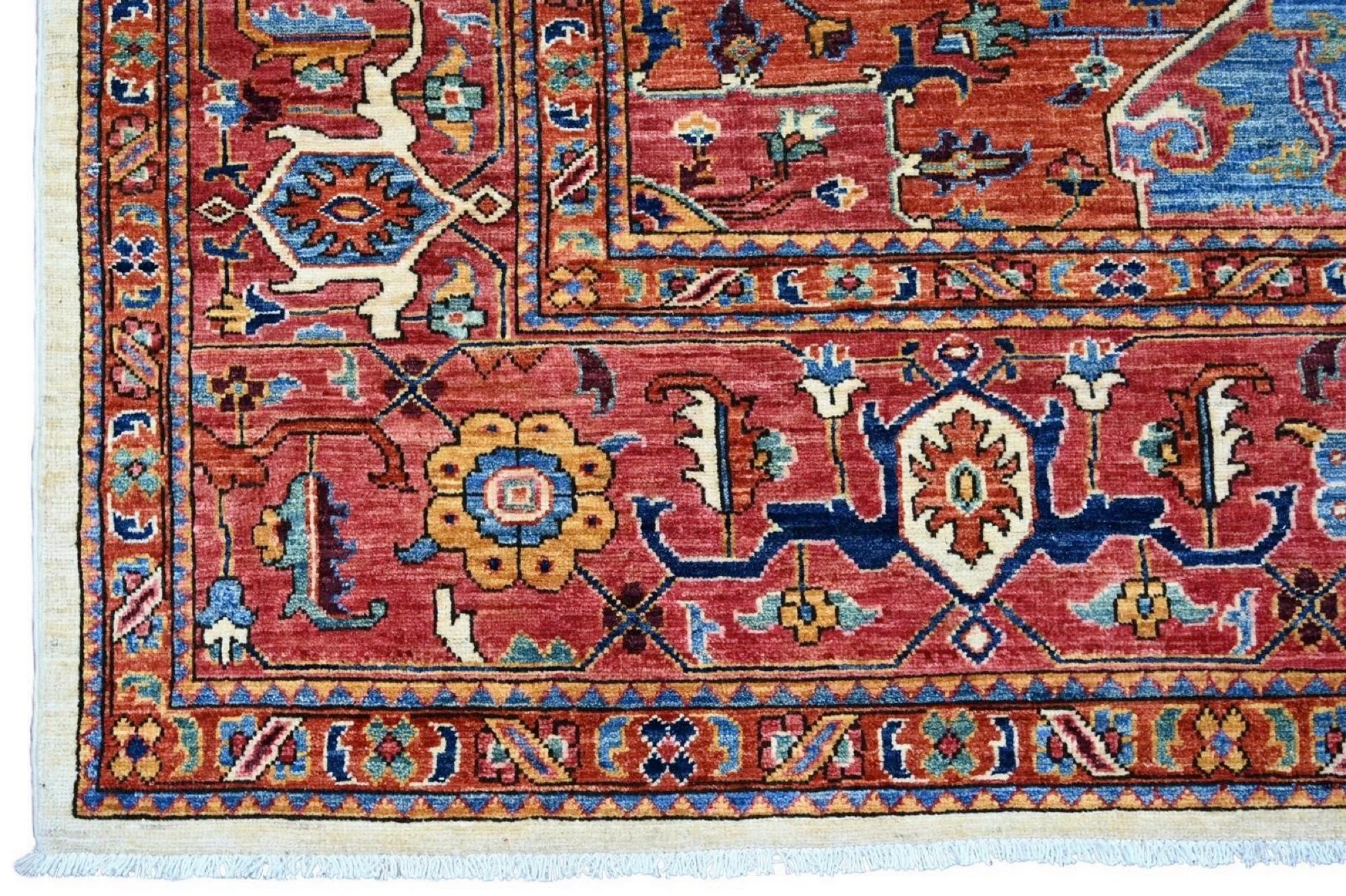 Dit exclusieve tapijt is geïnspireerd op de klassieke Perzische Heriz-motieven, maar opnieuw vormgegeven in een rustigere, modernere stijl met vrolijke en harmonieuze kleuren. Elk stuk is handgeknoopt in Afghanistan met handgesponnen wol en 100% plantaardige kleurstoffen, wat zorgt voor een natuurlijke glans en duurzame kleurechtheid. Hoewel traditionele Heriz-tapijten bekendstaan om hun krachtige geometrische vormen en markante medaillons, heeft dit moderne ontwerp een zachtere en eigentijdse uitstraling die perfect past in zowel klassieke als moderne interieurs. Zoekt u een handgeknoopt Heriz tapijt, een luxe Oosters design tapijt, of een tapijt met plantaardige verf? Dan is dit Heriz-geïnspireerde tapijt uit Afghanistan een uitstekende keuze — een elegant kunstwerk dat elke ruimte naar een hoger niveau tilt.
