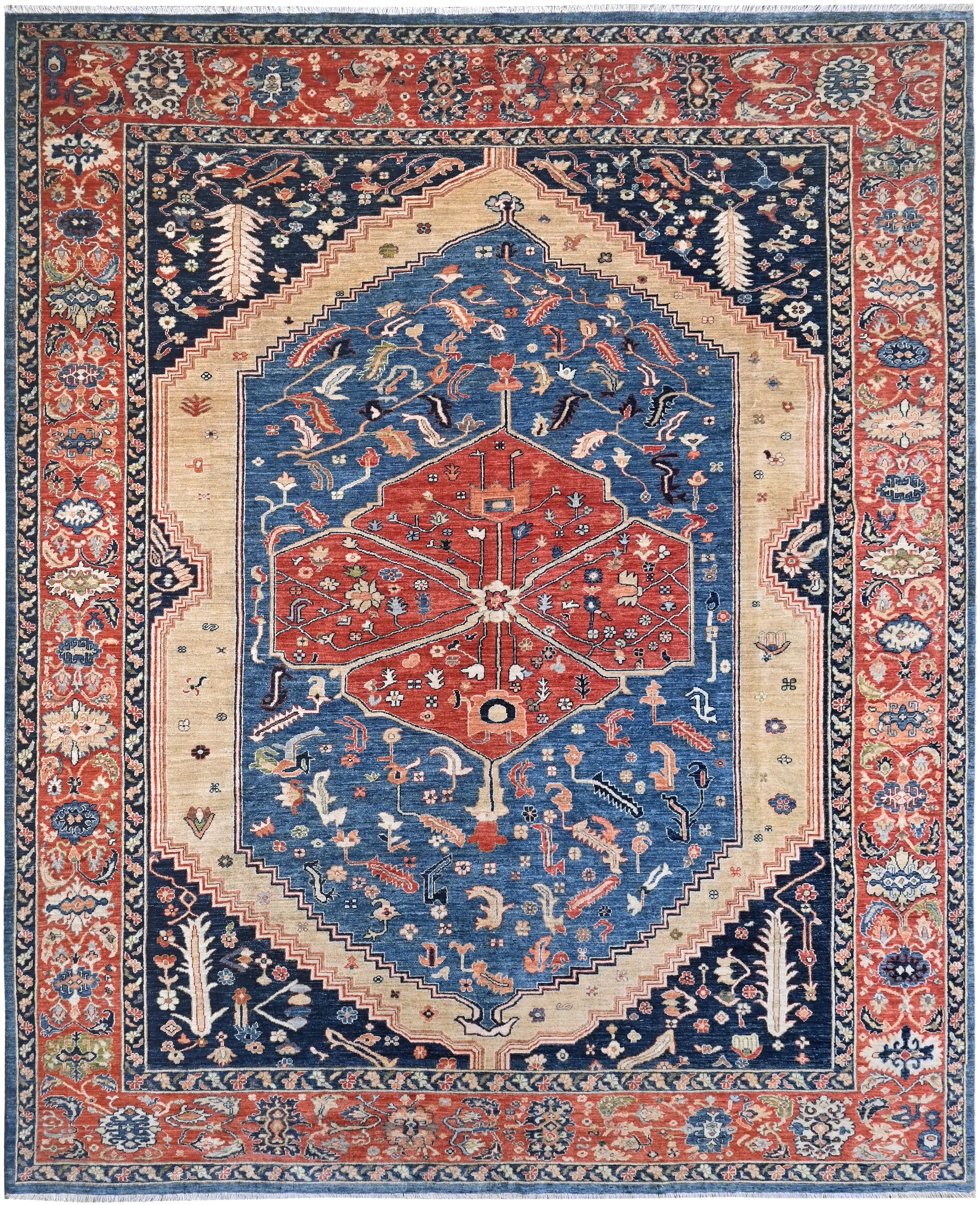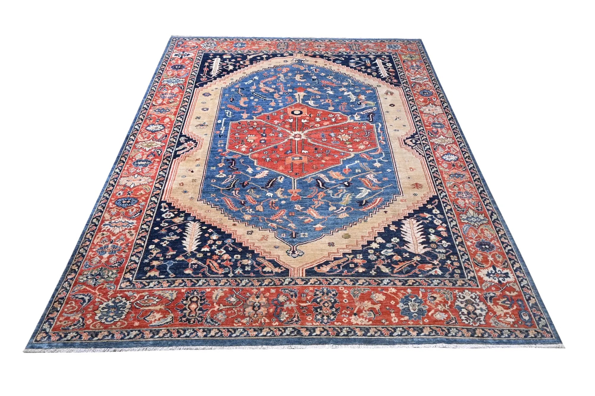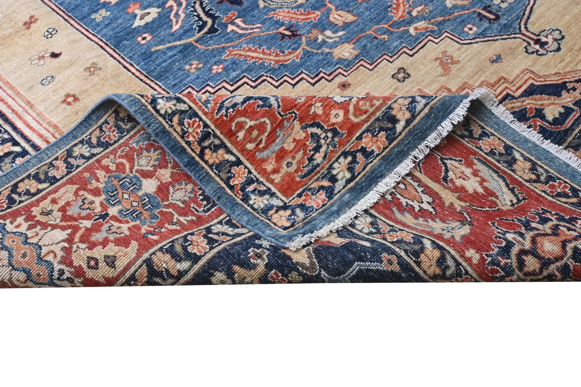 Dit exclusieve tapijt is geïnspireerd op de klassieke Perzische Heriz-motieven, maar opnieuw vormgegeven in een rustigere, modernere stijl met vrolijke en harmonieuze kleuren. Elk stuk is handgeknoopt in Afghanistan met handgesponnen wol en 100% plantaardige kleurstoffen, wat zorgt voor een natuurlijke glans en duurzame kleurechtheid. Hoewel traditionele Heriz-tapijten bekendstaan om hun krachtige geometrische vormen en markante medaillons, heeft dit moderne ontwerp een zachtere en eigentijdse uitstraling die perfect past in zowel klassieke als moderne interieurs. Zoekt u een handgeknoopt Heriz tapijt, een luxe Oosters design tapijt, of een tapijt met plantaardige verf? Dan is dit Heriz-geïnspireerde tapijt uit Afghanistan een uitstekende keuze — een elegant kunstwerk dat elke ruimte naar een hoger niveau tilt.