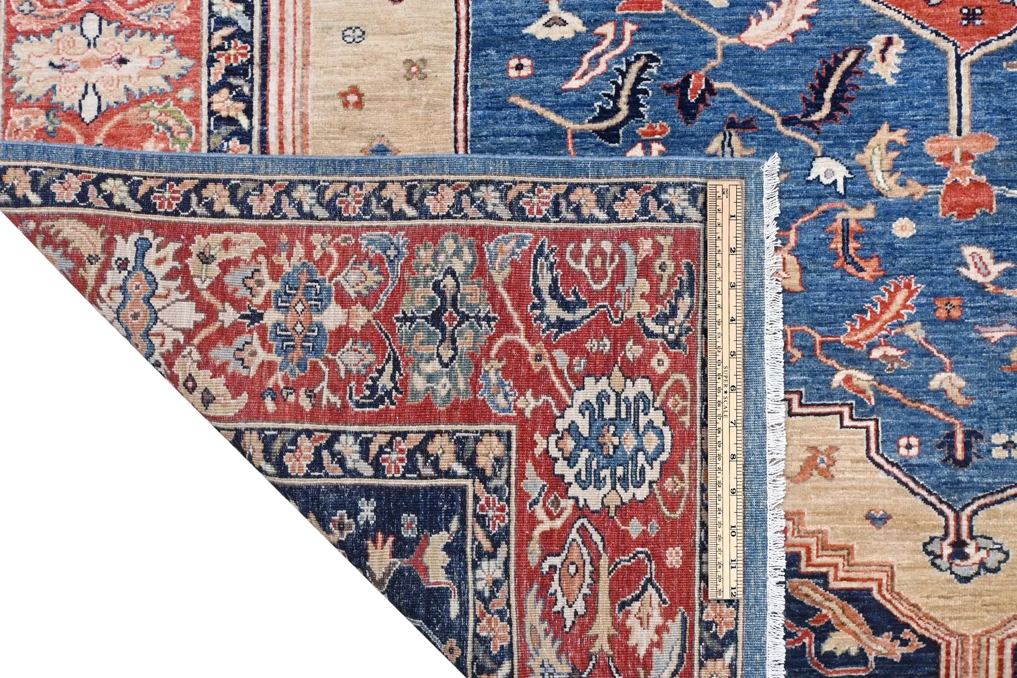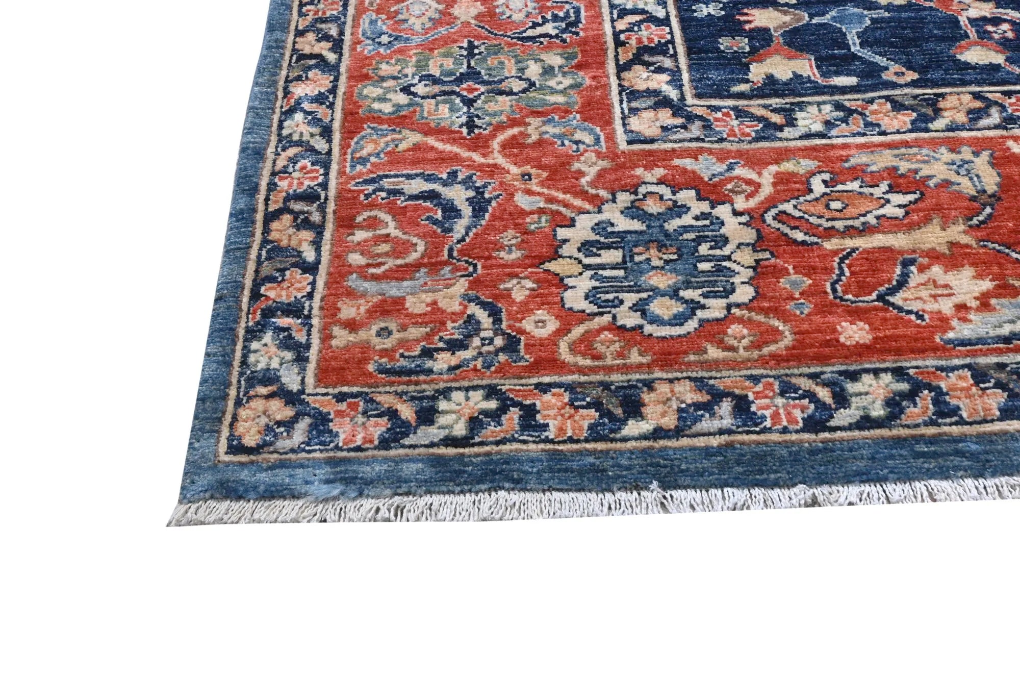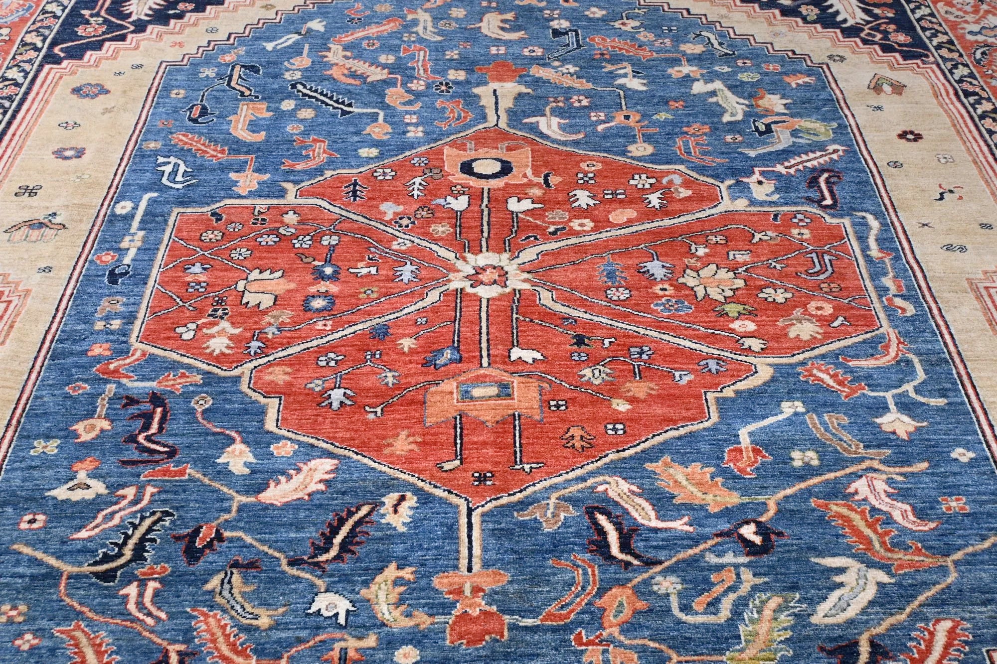 Dit exclusieve tapijt is geïnspireerd op de klassieke Perzische Heriz-motieven, maar opnieuw vormgegeven in een rustigere, modernere stijl met vrolijke en harmonieuze kleuren. Elk stuk is handgeknoopt in Afghanistan met handgesponnen wol en 100% plantaardige kleurstoffen, wat zorgt voor een natuurlijke glans en duurzame kleurechtheid. Hoewel traditionele Heriz-tapijten bekendstaan om hun krachtige geometrische vormen en markante medaillons, heeft dit moderne ontwerp een zachtere en eigentijdse uitstraling die perfect past in zowel klassieke als moderne interieurs. Zoekt u een handgeknoopt Heriz tapijt, een luxe Oosters design tapijt, of een tapijt met plantaardige verf? Dan is dit Heriz-geïnspireerde tapijt uit Afghanistan een uitstekende keuze — een elegant kunstwerk dat elke ruimte naar een hoger niveau tilt.